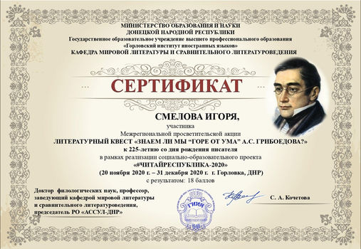 В декабре 2020 года проходила Межрегиональная просветительская акция ЛИТЕРАТУРНЫЙ КВЕСТ «ЗНАЕМ ЛИ МЫ «ГОРЕ ОТ УМА» А.С. ГРИБОЕДОВА?» в рамках реализации социально-образовательного проекта «#ЧИТАЙРЕСПУБЛИКА–2020»